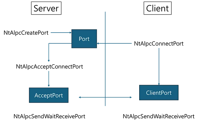 ALPC ports are generally created by NtAlpcCreatePort, and connected to by other processes via NtAlpcConnectPort[Ex], and accept clients by NtAlpcAcceptConnectPort. After a connection is established, messages are passed via NtAlpcSendWaitReceivePort. So the overall flow of ALPC communication is as follows.