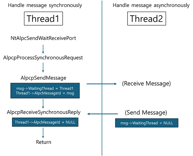 And then, at [6], the message is handled by AlpcpDispatchReplyToWaitingThread, AlpcpDispatchReplyToPort, or AlpcpDispatchNewMessage depending on the fields in the message. These functions handle ALPC_MSGFLG_SYNC_REQUEST in a similar way, while other processing parts may be different.