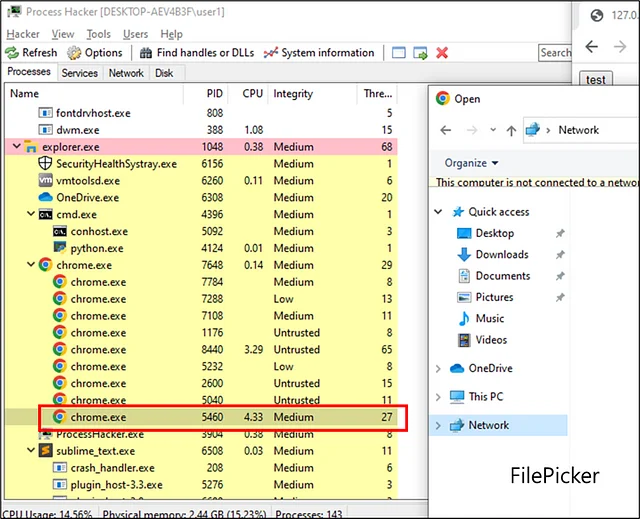 To spray threads of a high privileged process, we used showOpenFilePicker(); when the API is called, Chrome creates a new process in medium integrity. Also, the file picker process spawns many threads on creation, which makes it suitable for exploitation.