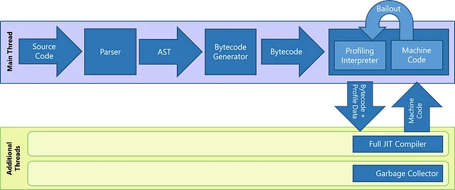 The Chakra JIT is responsible for generating optimized JITâed code for functions and loops that are invoked many times. This process is split into multiple stages, with the Full JIT Compiler and Garbage Collection stages occuring in a background thread. An explaination of the pipeline and helpful diagrams can be found on MSDN.