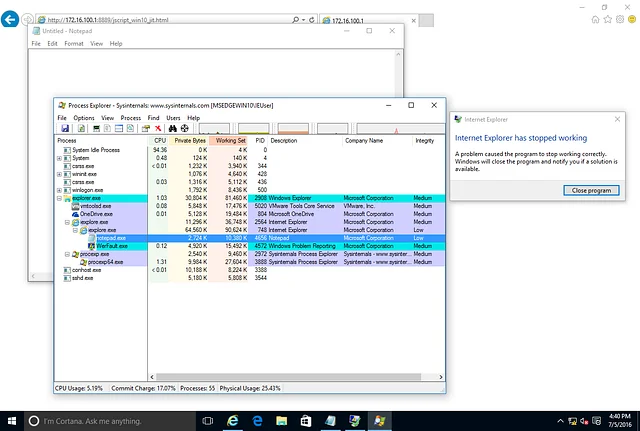 Our second-stage shellcode can now be any length, so in our exploit we use a metasploit-generated shellcode that executes notepad.exe. In practice, this second-stage would be responsible for bypassing protected mode (sandbox).
