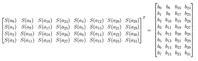 Assuming an input state of the form [a₀,a₁,a₂,a₃,a₄,…aₙ₋₁], the substitution and transposition operations can be viewed as matrix operations resulting in a 8x4 matrix. The function S applies substitution on a byte using the S-box.