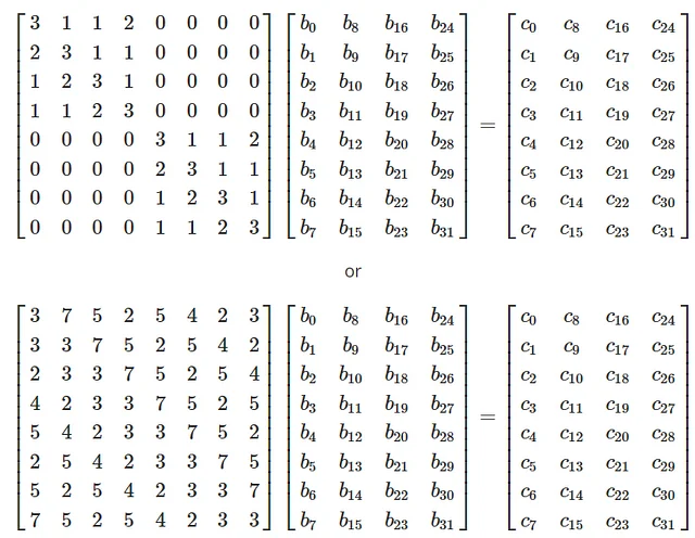 In either case, the resultant matrix is stored as [c₀, c₁, …, cₙ₋₁]and is bitwise XOR with the round key.