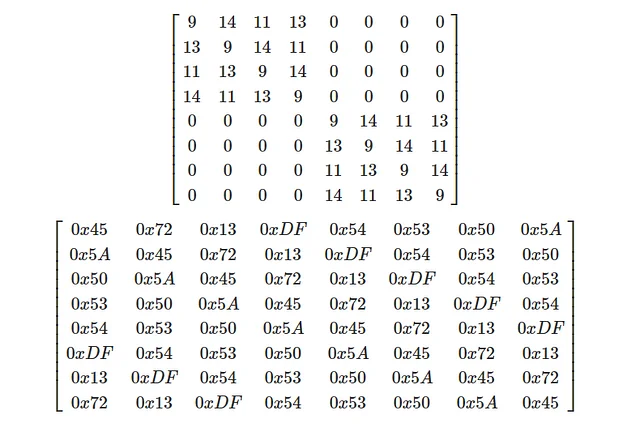 NES is an almost involutional SPN block cipher. Encryption and decryption share the same code and differ only in the key schedule, S-box, and P-box. During decryption, the following inverse matrices are used for the even and odd rounds: