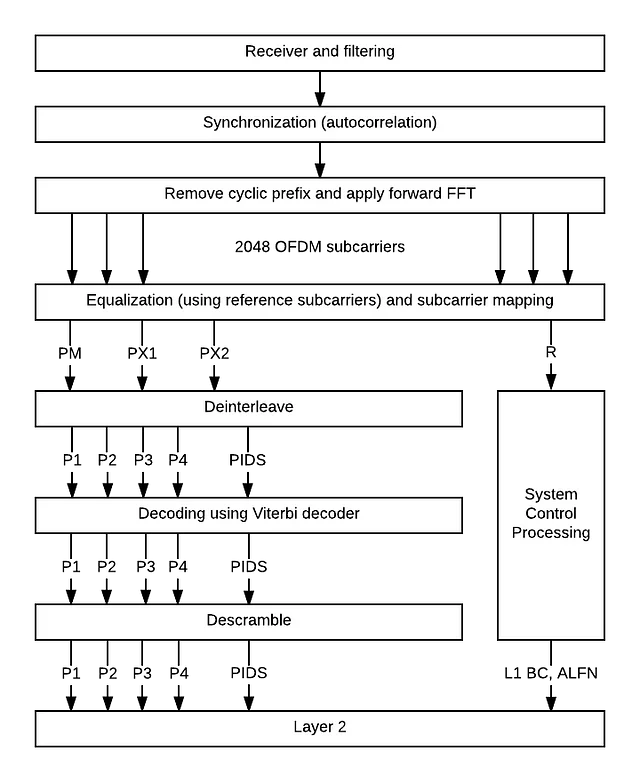 The system is split into several layers. The physical layer ( layer 1) is responsible for finding the signal, decoding, and error correction. The multiplexer ( layer 2) allows multiple layer 3 applications to share the bandwidth, giving priority to the real-time audio data. And the application layer ( layer 3) is where the decoding of the audio data actually happens.