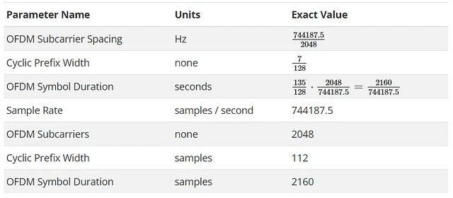 The result of the correlation also enables minor correction of the frequency of the signal. If there is “small” frequency offset, then it will introduce a phase shift between the cyclic prefix and the matching samples at the end of the symbol. This phase shift is the complex argument, or phase angle, of the correlation. Since there are 2048 samples between the cyclic prefix and the matching samples, and the sample rate is 744187.5, we can estimate the frequency offset as: