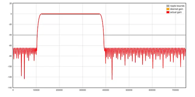 The first step is to receive the signal at the center frequency for the radio station, and filter out the analog audio. We chose to receive the signal at twice the sample rate, ~1.488 MHz, and use a decimating band-pass filter to eliminate the analog audio and act as an anti-aliasing filter. The filter does not need to be exact; the filter taps we used allow frequencies 122457 Hz — 372095 Hz to pass through. Eliminating the analog audio makes it easier for the timing synchronization and frequency error correction in the next steps.