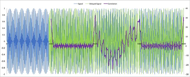 Once we have a signal at the correct sample rate and approximately the correct frequency, we can use autocorrelation to find the start of the cyclic prefix. One of the prolems with OFDM is that even small timing offsets or frequency errors will result in the loss of orthogonality and corrupted data. Thankfully, we can fix both of these issues using the cyclic prefix that was inserted by the transmitter.
