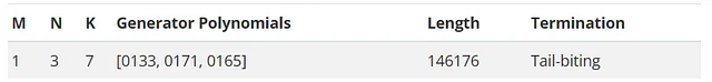 The frame can now be passed into a Viterbi decoder for the 1/3 mother code. A M/N code has M input bits for N output bits. Since we are decoding a block of 438528 bits, the original input size was 146176 bits. Also, a convolutional code has a constraint length ( K=7 ) which determines how many input bits influence the next output bit. The complete parameters are in the table below, and generally match the parameters used by LTE.