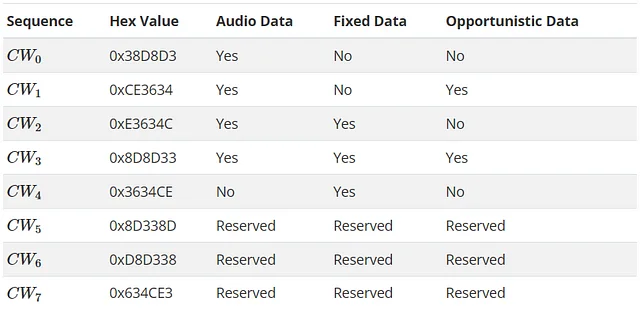 The L2 PDU contains a 24-bit value (PCI) whose bits are spread out across the L2 PDU. The PCI indicates whether there is audio data, fixed data, and/or opportunistic data. We are only interested in decoding the audio data from logical channel P1, so we know there will always be audio data and we can ignore the PCI value, but we still need to remove it to extract the MPS/SPS PDUs. To remove the PCI value from a P1 L2 PDU, remove the bits at offsets [116176, 117424, …, 144880]. Page 13 of the layer 2 reference documentation has the generic algorithm to handle other L2 PDUs and the valid PCI values are below.