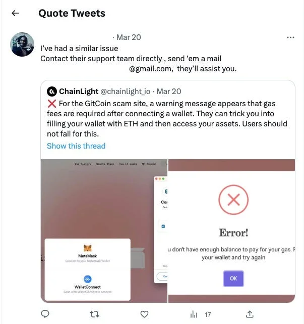 저희가 작성한 트윗은 “Gitcoin, Lido Finance의 스캠 사이트를 발견했고 유저들은 지갑을 연결할 때 조심해야 한다.”는 내용이었는데, 수상한 한 유저는 이 트윗을 인용해서 위와 같이 트윗을 인용한 문구를 작성했습니다.