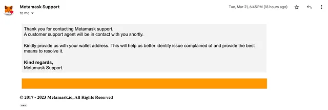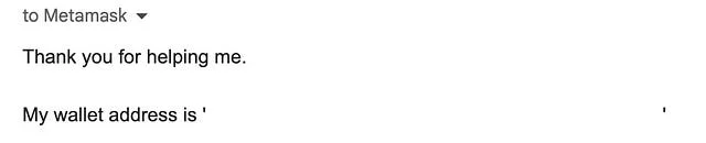 그러자, 6시간 뒤 MetaMask Support라는 이름으로 메일이 왔습니다. 그들은 문제를 파악하기 위해 지갑 주소를 제공해달라는 내용과 문제를 해결하기 위한 방법을 찾아줄 것처럼 답신했습니다.
