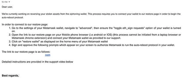 지갑 주소를 기재해서 보내자, 이번에는 이메일 답장이 이전보다 더 빠르게 왔습니다. 그들은 도난당한 자산을 복구하기 위해 작업 중이라고 했고, 이 작업을 수행하기 위해서는 제공한 웹사이트 내의 restore page에서 지갑을 연결해야 한다고 언급하며 어떻게 자산을 찾을 수 있을지 친절하게 알려줬습니다.