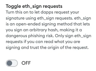 그들이 요구한 첫 번째 사항은 MetaMask wallet 설정에서 ‘toggle eth_sign requests’ 옵션을 turn on 하라는 것인데, 이 옵션은 Dapp이 연결된 지갑의 통제 권한을 가져갈 수 있는 옵션을 의미합니다.