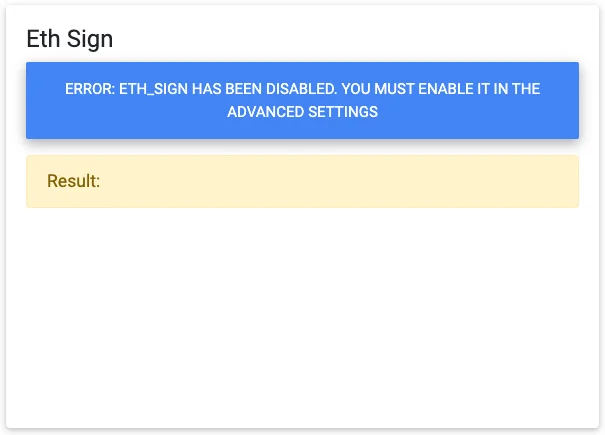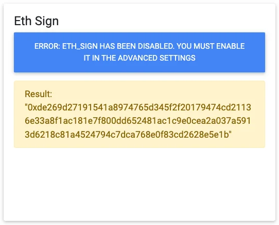 그럼 eth_sign이 비활성화되어 있으며 Advanced settings를 통해 활성화를 시켜야 한다는 경고문이 표출됩니다. 비활성화 시에는 MetaMask extension이 반응하지 않았습니다.