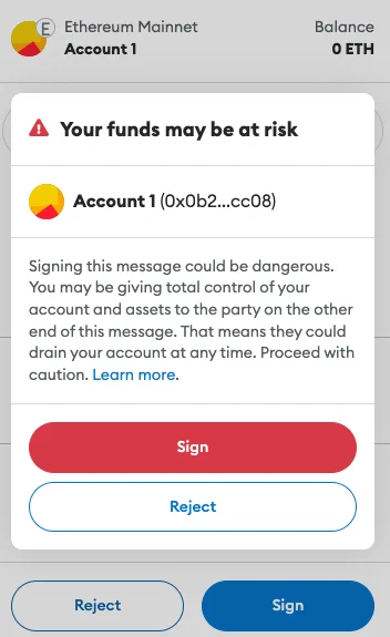 지갑을 연결하자마자 계정의 통제 권한에 대한 요청이 뜨면서 MetaMask의 경고문이 표출됩니다. 만약 큰 금액의 자산을 탈취당한 사람이라면, 자금을 돌려받을 수 있다는 가능성에, 표출된 경고문을 무시할 가능성이 있으니 내용을 정독하고 경고를 유의해야 합니다.