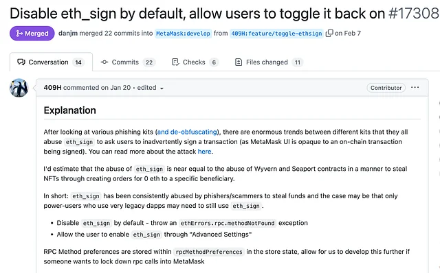 이처럼, 경고 표출 기능과 eth_sign 토글의 비활성화 기본값 설정은 처음부터 구현이 된 기능이 아니라 유저들의 요청과 제안에 의해 추가된 기능입니다. 유저들은 스캠 행위를 하는 사람들이 많아지고 이를 통해 위험한 상황을 겪자, 자발적으로 MetaMask 측에 건의했고, MetaMask는 해당 제안을 수용해서 소프트웨어에 반영했습니다.