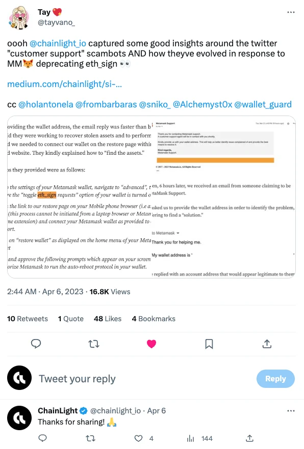 MetaMask의 직원인 @tayvano_는 ChainLight의 미디엄 글을 인용하여, 커뮤니티에 주의를 요구하고 eth_sign 기능을 더 이상 기본값으로 지원하지 않는 MetaMask에서 유저에게 사기 행위를 하기 위한 악성 유저의 사기 방식 고도화에 관한 트윗을 게시했습니다.