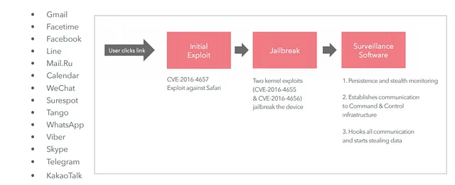 ๊ธฐ์ฌ์ ๋ด์ฉ์ ๋ฐ๋ฅด๋ฉด ์คํ์ด์จ์ด์ ์ ์๊ณผ ํ๋งค์ ์ด์ค๋ผ์์ NSO ๊ทธ๋ฃน์ด ์ฐ๊ด๋์ด ์์์ ํ์ธํ ์ ์์์ต๋๋ค. NSO ๊ทธ๋ฃน์ ์ด์ ์๋ ์คํ์ด์จ์ด๋ฅผ ์ ์ ๋ฐ ํ๋งคํ์์ผ๋ฉฐ, 2016๋ ์๋ Citizen Lab๊ณผ Lookout Security์์ ํด๋น ์คํ์ด์จ์ด์ ๋ํ ๋ถ์์ ์งํํ ๋ณด๊ณ ์[2]๋ฅผ ๋ฐํํ์์ต๋๋ค.๊ตฌ์ฒด์ ์ธ ๊ณต๊ฒฉ ๋ฐฉ์๋ ํจ๊ป ๊ณต๊ฐ๋์๋๋ฐ, ๊ณต๊ฒฉ์๋ ํ์ ์ด๋ ๋์์๊ฒ SMS, ์ด๋ฉ์ผ, SNS ๋ฑ์ ํตํด ์น URL์ ์ ๋ฌํ์์ต๋๋ค. (์๋ ์ฌ์ง ์ฐธ๊ณ )