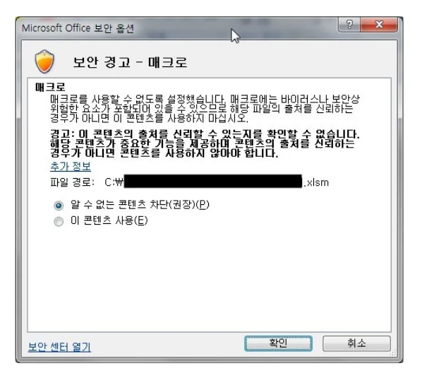 Microsoft Excel๋ ๊ตญ/๋ด์ธ๋ก ๋ง์ด ์ฌ์ฉํ๋ ๋ฌธ์ ์ํํธ์จ์ด์ ๋๋ค. Excel์์ ํน์ ํ์ผ ๋ก๋ ์ ํด๋น ํ์ผ์ ๋งคํฌ๋ก ์คํฌ๋ฆฝํธ๊ฐ ํฌํจ๋ ๊ฒฝ์ฐ ํ๋กฌํํธ๋ฅผ ํตํด ์ด์ฉ์์๊ฒ ๊ฒฝ๊ณ ๋ฅผ ํด์ฃผ๋ฉฐ, ์คํ ์ฌ๋ถ๋ฅผ ์ ํํ๋๋ก ํฉ๋๋ค.