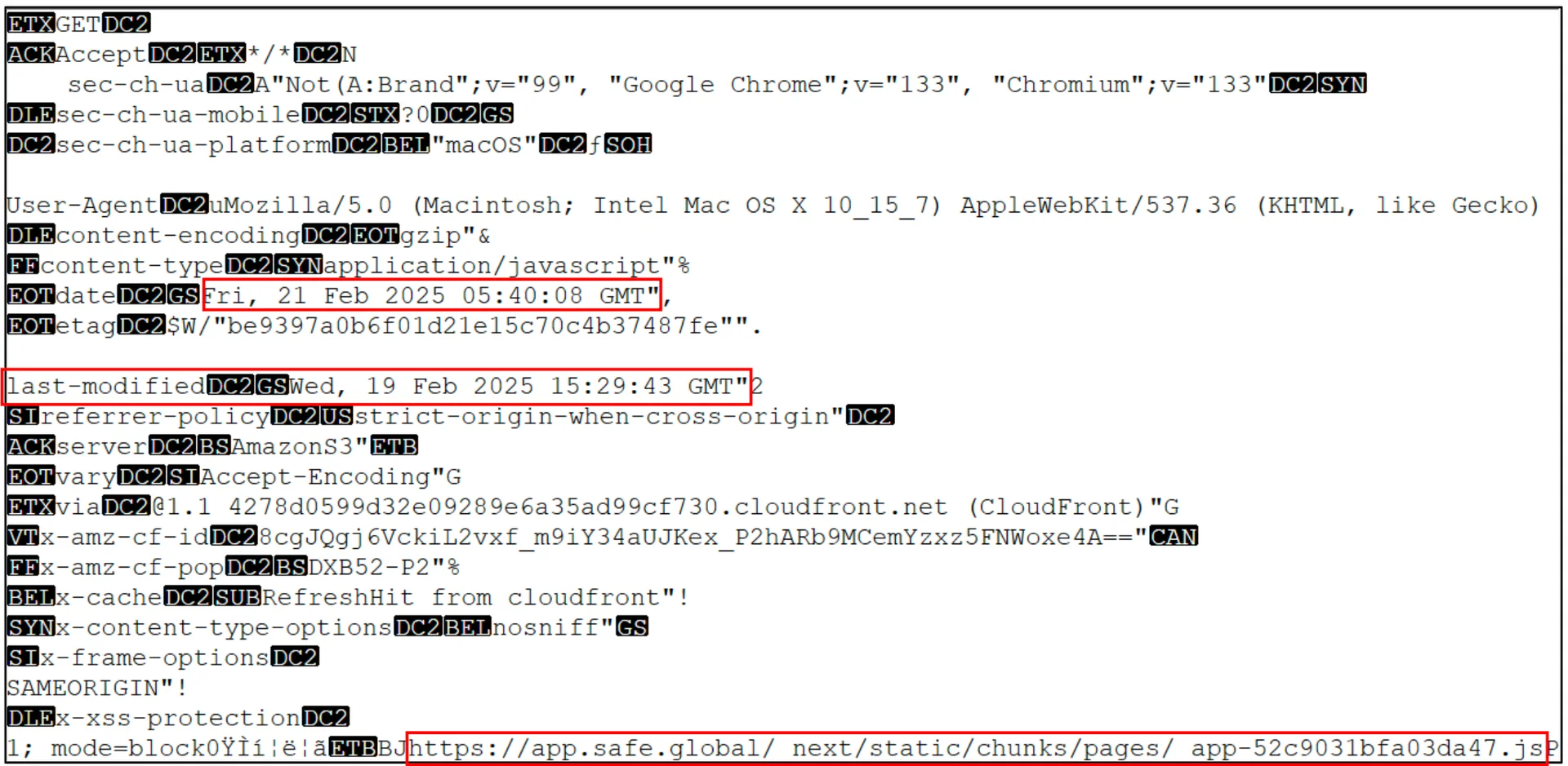 ์ฐ๋ฐฉ์์ฌ๊ตญ์ ๋ฐ๋ฅด๋ฉด, ์ด ๊ณต๊ฒฉ์ ๋ถํ๊ณผ ์ฐ๊ณ๋ ํดํน ์กฐ์ง TraderTraitor์ ์ํด ์ํ๋์์ต๋๋ค. ์กฐ์ฌ ๊ฒฐ๊ณผ, Safe{Wallet}์ ํตํด ์ฝ๋์๋ ์์ ์์๋ ์ผ๋ก ETH๋ฅผ ์ฎ๊ธฐ๋ ๋ฉํฐ์๊ทธ ํธ๋์ญ์ ์ ์ฒ๋ฆฌ ๊ณผ์ ์ ๊ณต๊ฒฉ์๊ฐ ๊ฐ์ ํ ๊ฒ์ด ๋ฐํ์ก์ต๋๋ค. ๋ฐ์ด๋นํธ ํดํน ์ฌ๊ณ ์กฐ์ฌ๋ฅผ ๋งก์ Sygnia๊ฐ ๋น์ ํธ๋์ญ์ ์๋ช ์ ์ฌ์ฉ๋ ๊ธฐ๊ธฐ์ ๋ธ๋ผ์ฐ์ ๋ฅผ ์กฐ์ฌํ์๊ณ , Chrome ๋ธ๋ผ์ฐ์ ์ ์บ์ ํ์ผ์ ํฌ๋ ์ํ์ฌ ๋ถ์ํ ๊ฒฐ๊ณผ ํธ๋์ญ์ ์๋ช ์์ ์ ์์ฑ๋ JavaScript ๋ฆฌ์์ค ํ์ผ์ด ๊ณต๊ฒฉ ํฌ์ธํธ๋ก ์ง๋ชฉ๋์์ต๋๋ค. ํด๋น JavaScript ๋ฆฌ์์ค ํ์ผ์ Safe{Wallet}์ AWS S3 ๋ฒํท์์ ์ ๊ณตํ๋ ๊ฒ์ผ๋ก, HTTP ํค๋ ๋ถ์ ๊ฒฐ๊ณผ ์๋์ ๊ฐ์ด ๋ง์ง๋ง ์์ ์ผ์๊ฐ 2์ 19์ผ์ธ ๊ฒ์ ํ์ธํ ์ ์์์ต๋๋ค.
