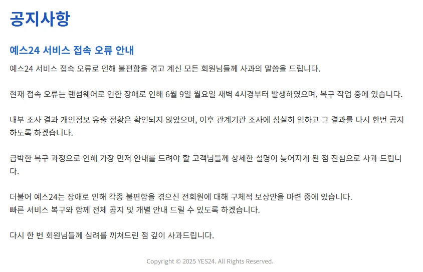2025๋ 6์ 9์ผ, ๊ตญ๋ด ๋ํ ์จ๋ผ์ธ ์์ ์ด์ ๊ณต์ฐ ํฐ์ผ ์๋งค ํ๋ซํผ์ธ Yes24๊ฐ ์ ์ฒด๋ถ๋ช ์ ๋์ฌ์จ์ด ๊ณต๊ฒฉ์ ๋ฐ์ ์ ์ฌ์ ์๋น์ค๊ฐ ๋ง๋น๋๋ ์ฌ๊ฑด์ด ๋ฐ์ํ์ต๋๋ค. ์ฌ๊ฑด ์งํ Yes24๋ ํํ์ด์ง ์ ์ ๋ถ๊ฐ ๊ณต์ง๋ฅผ ๋์ฐ๊ณ ๋ด๋ถ ๋ณต๊ตฌ ์์ ์ ์ฐฉ์ํ์์ง๋ง, ๊ตฌ์ฒด์ ์ธ ์์ธ์ ๊ณต๊ฐํ์ง ์์๊ณ , ๊ณต๊ฒฉ ๋ฐ์ ์ฝ 36์๊ฐ ํ ์ธ๋ก ๋ณด๋๋ฅผ ํตํด ๊ณต์์ ์ผ๋ก ๋์ฌ์จ์ด ๊ณต๊ฒฉ ์ฌ์ค์ ๋ฐํ์ต๋๋ค.