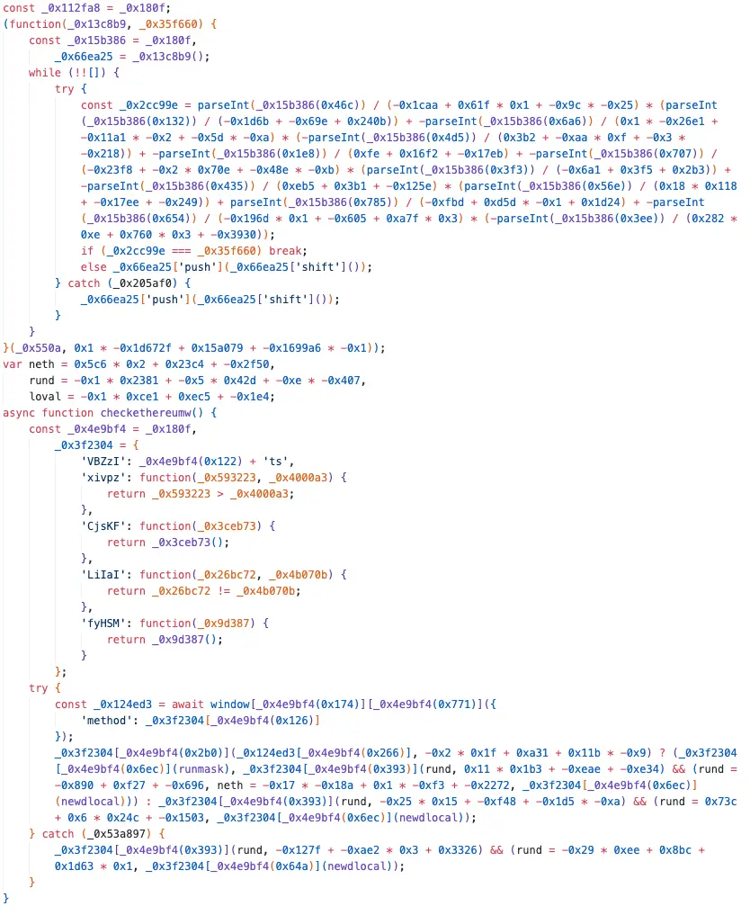 ์ด๋ฒ ๊ณต๊ฒฉ์ ๊ธฐ์ ์ ํน์ง ์ค ๊ฐ์ฅ ์ฃผ๋ชฉํ ๋ถ๋ถ์ ์ ์ฑ ์ฝ๋์ ๋์ ํ๊ฒฝ๊ณผ ๋ชฉํ์ ๋๋ค. ์๋ฒ ์ธก ์ ธ ๊ถํ์ ํ๋ํ๊ฑฐ๋ ๋์ฌ์จ์ด๋ฅผ ๋ฐฐํฌํ๋ ์ ํต์ ์ธ ๊ณต๊ฒฉ ๋ฐฉ์๊ณผ ๋ฌ๋ฆฌ, ์ด๋ฒ ๊ณต๊ฒฉ์์๋ ๋ธ๋ผ์ฐ์ ํ๊ฒฝ์์ ์คํ๋๋ฉฐ ์ํธํํ ์ง๊ฐ์ ํ์ทจํ๋๋ก ์ค๊ณ๋ Crypto Wallet Drainer ํ์ด๋ก๋๊ฐ ์ฌ์ฉ๋์์ต๋๋ค.