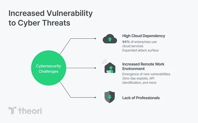 그렇다면, 왜 조직은 사이버 위협에 더욱 취약해졌을까요? 첫 번째 이유는 클라우드 서비스 의존도가 크게 높아졌기 때문이에요. 실제로 기업의 94%가 클라우드 서비스를 사용하고 있어, 구성 오류, 부적절한 접근 제어가 빈번하게 발생하고 공격 가능한 표면이 이전보다 넓어졌습니다. 두 번째는 팬데믹 이후 급격히 늘어난 원격 근무 환경으로 취약점이 덩달아 증가한 것이에요. 알려진 취약점뿐 아니라 제로데이, API 식별 등 취약점 발견, 관리, 적절한 대응이 어려워지고 있습니다. 여기에 사이버 보안 전문 인력의 부족까지 모든 요인이 복합적으로 작용해 조직의 사이버 보안 태세가 약화되고 있어요.