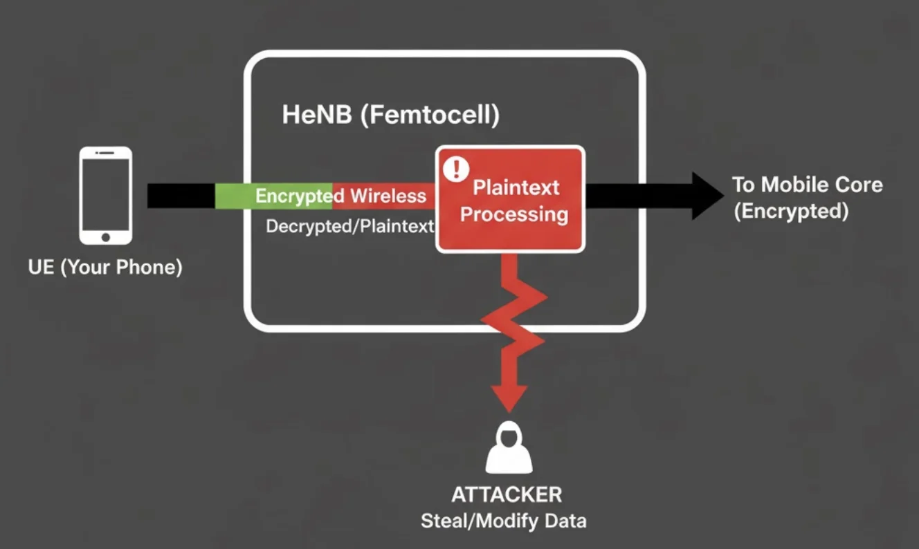 개조된 펨토셀은 주변 단말을 유인(단말은 더 강한 신호의 셀에 붙는 성질이 있음)하여 실제 통화·문자·데이터를 송수신하는 경로에 개입할 수 있습니다. 핵심 문제는 단말이 정식 기지국으로 신뢰하는 엔드포인트가 가정 내부로 들어온다는 점이며, 이 때문에 설계 단계에서의 신뢰 경계(trust boundary) 정의와 키 보호, 인증 절차 강화가 중요합니다. 실제 위협 사례들은 과거 장비들에서 주로 보고되었지만, 개념적 원리는 현대 장비에도 적용될 수 있습니다.