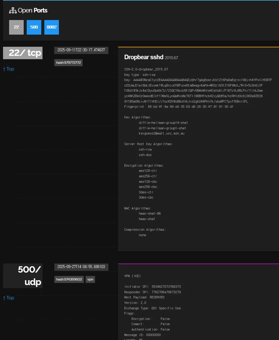 하지만 Shodan에 노출된 펨토셀 장비의 서비스 비활성화 이력을 확인한 결과, SSH 접근 제어가 제대로 수행되지 않은 채 운영된 사례가 다수 존재하였습니다. 특히 SSH 서비스의 경우 소액결제 사건 이전까지 활성화된 상태로 운용되었고, 사건 이후 보안 대책의 일환으로 비활성화되거나 접근 제어가 강화된 것으로 보이는 정황이 확인되었습니다.