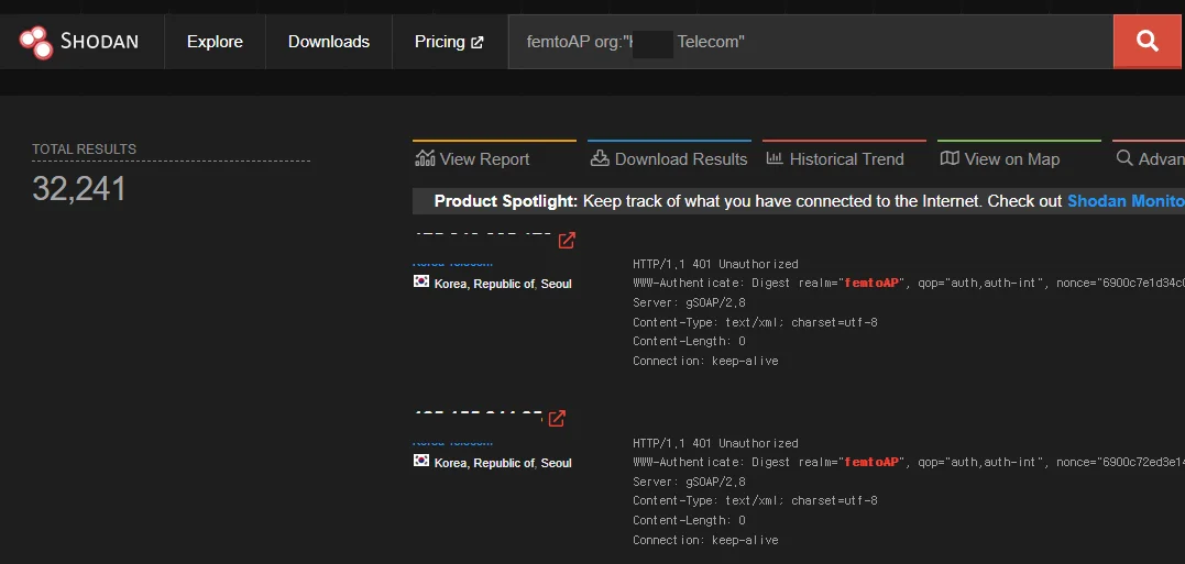언론 보도에 따르면 A사는 약 157,000대의 펨토셀을 보급했으며, 그중 약 57,000대는 현재 신호가 잡히지 않는 상태입니다. 또한 Shodan으로 시그니처 기반 검색을 수행한 결과 32,000대가 넘는 펨토셀이 인터넷에 노출되어 있었습니다. 이는 A사의 펨토셀들이 잠재적으로 공격 대상이 될 수 있다는 것을 의미합니다.