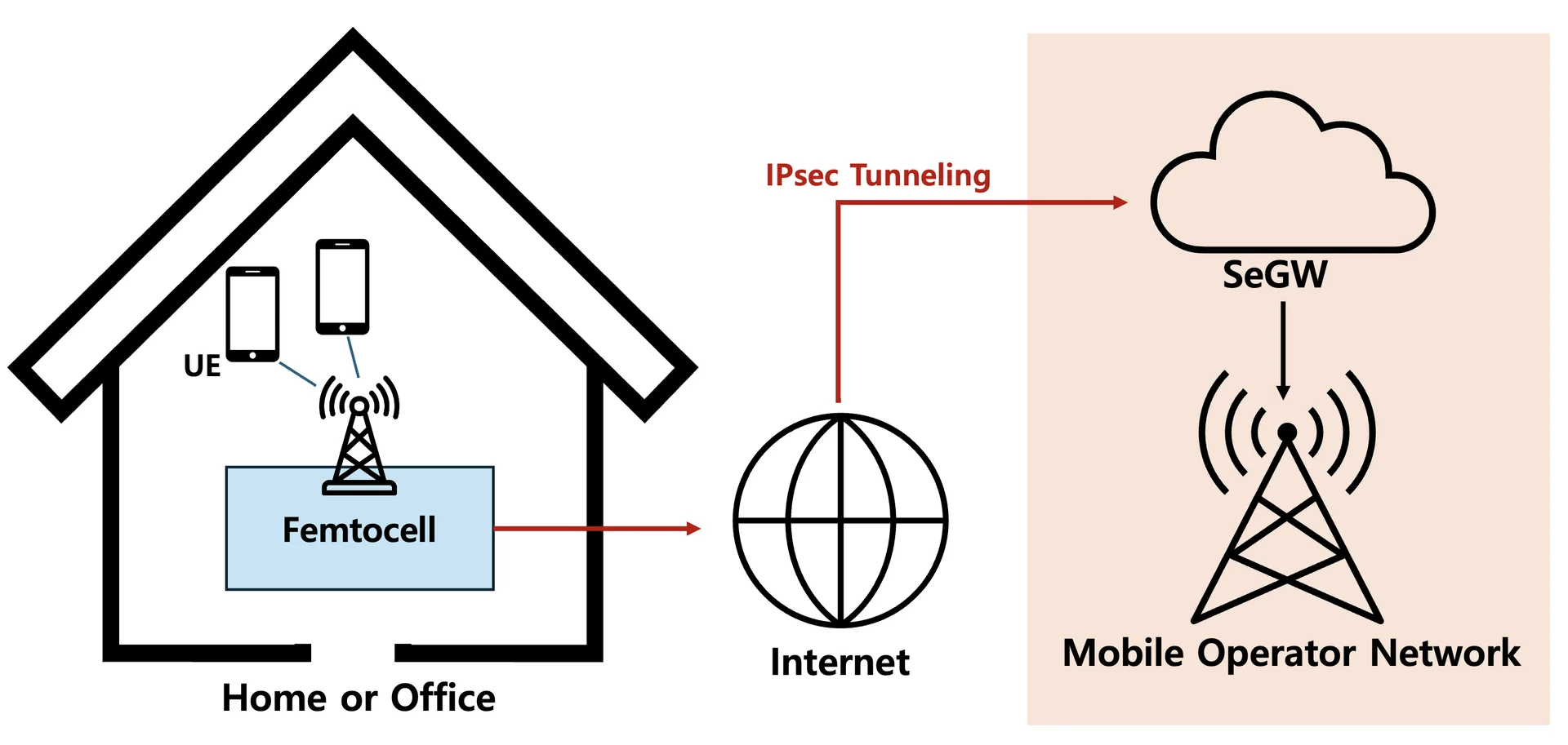 HeNB는 일반적으로 통신사 경계에 위치한 SeGW(Security GateWay)와 IPsec 암호화 터널을 형성하여, 외부 네트워크로부터의 접근을 보호합니다. 필요에 따라 다수의 HeNB를 묶어 전송을 중계하는 HeNB-GW(Home eNodeB Gateway)를 거쳐 코어망으로 데이터를 전달하기도 하며, 이러한 구조와 보안 절차는 3GPP에서 정의한 표준 아키텍처를 기반으로 구현됩니다.