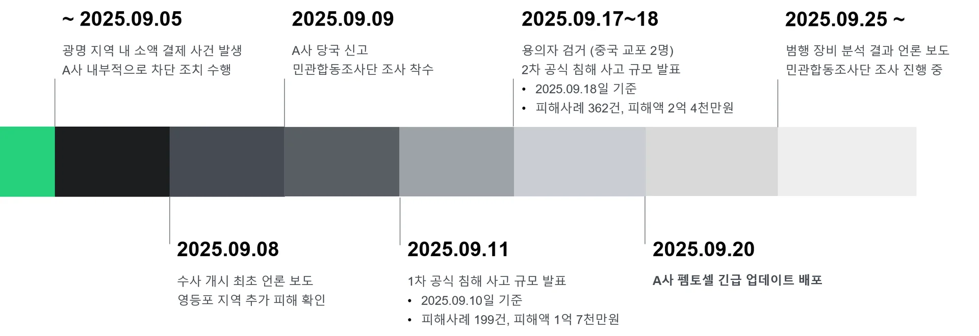 A사는 9월 초 내부적으로 이상 징후를 인지하고 차단 조치를 시행하였으며, 해당 사건은 9월 8일 언론에 보도되었습니다. 언론 보도 후, A사는 본 사건을 사이버 침해 사고로 공식 인정하고 보안 정책을 강화하였으며, 피해 이용자 대상 보상을 제공하고 유심 교체를 지원하였습니다.