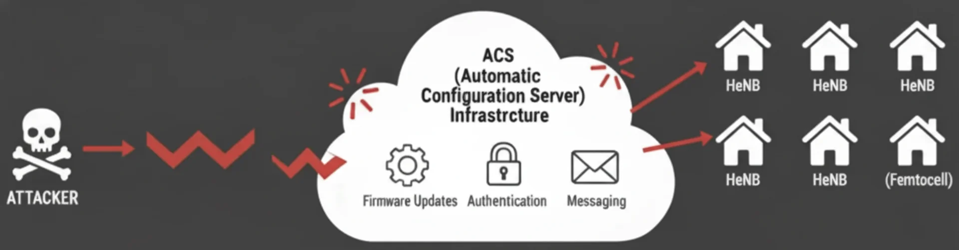 HeNB는 원격 구성 및 관리(예: 초기 설정, 펌웨어 업데이트)를 위해 TR-069(CWMP) 기반으로 ACS(Automatic Configuration Server)와 통신합니다. TR-069는 원격 구성, 상태 모니터링, 파일 전송 등 관리 기능을 제공하며, TR-196(FAPService) 데이터 모델을 통해 무선 파라미터, 인증 정보, AccessMode, CSG 같은 요소를 원격으로 제어할 수 있습니다. 따라서 ACS 인프라가 침해되거나 TR-069 구현이 부실하면 원격에서 구성 변경, 비인가 펌웨어 주입, 로그 및 키 수집 등이 가능해지고, 이는 펨토셀 네트워크 전반의 보안에 심각한 영향을 미칠 수 있습니다.