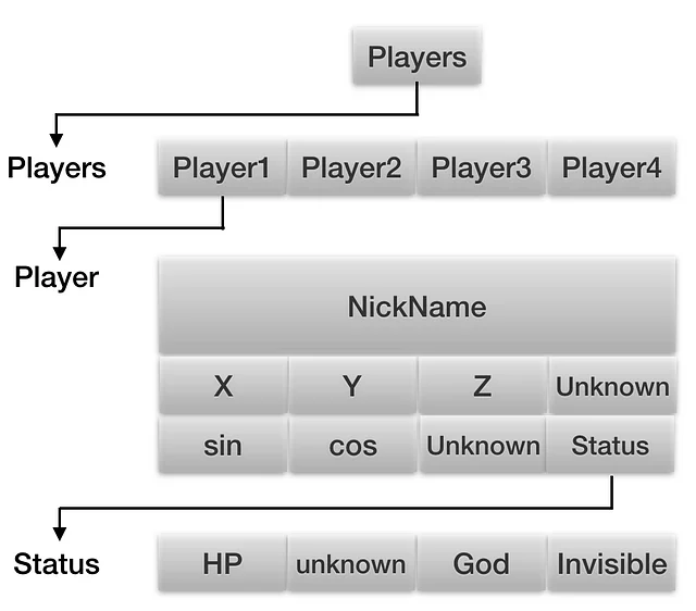 아래는 게임 데이터의 구조체 예시와 도식도이다. 실제 게임 해킹에서 이러한 데이터는 게임 바이너리 리버싱을 통해 알아내야 한다.