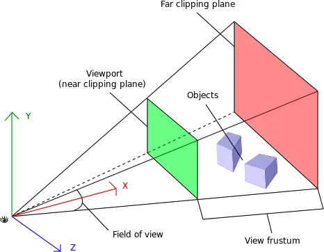 이 그림에 대해 이해하려면 먼저 카메라에 대한 개념이 필요하다. 우리가 현실에서 눈을 통해 물체들을 보는 것처럼, 게임 내에서도 물체를 보기 위한 ‘무언가’ 가 필요하다. 바로 이 ‘무언가’를 카메라라고 한다. 게임 내 물체들은 이 카메라를 통해 화면에 보이게 된다. 위 그림에서 카메라는 눈 표시가 있는 지점에 존재한다.