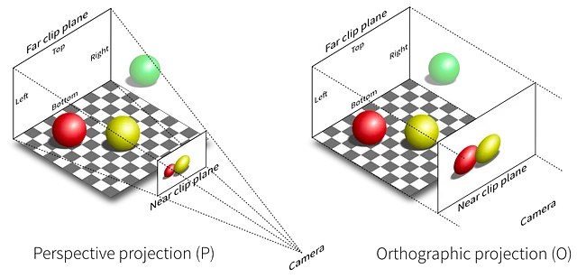 따라서 물체들은 실제 위치가 아닌 카메라 기준으로 보이게 된다. 그래서 실제 위치만으로는 화면에 어디에 표시되어야 하는지 알 수 없다. 그렇기에 이런 실제 위치(월드 좌표)를 카메라 기준으로 어디에 보이는지(화면 좌표)로 변환하는 과정이 필요하다. 이를 변환하는 방법은 다양한데 이 글에서는 2가지를 다룰 것이다.