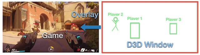 Overlay는 새로운 D3D 창을 생성해 게임과 겹쳐 보이도록 하는 기법이다. D3D를 이용해 물체 그리는 것은 동일하나 투명한 창이 생성된다는 점에서 EndScene() 함수를 후킹하는 방법과 차이를 보인다.