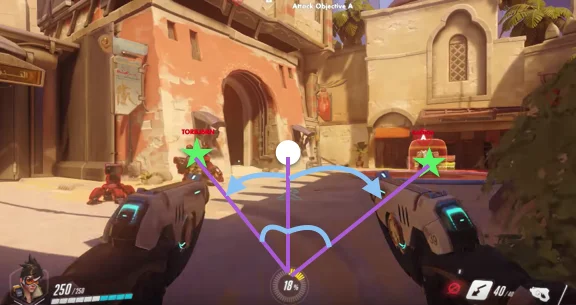 위 그림에서 흰색 점이 조준점이고 초록 별이 조준할 대상이라고 하자. 각도를 계산하여 회전하는 방식은 화면상에서 조준점을 대상에 직선 이동하는 것이 아니라, 파란 화살표처럼 게임 내 화면(카메라)을 회전하는 방식이다. 이때 회전할 각도를 계산하는 것이 이 조준 방식의 핵심이다. 게임에는 화면 회전을 위해 카메라의 방향을 나타내는 값이 존재한다. 게임 메모리 내 화면 방향을 제어하는 값을 변조하면 화면을 회전시킬 수 있다. 임의의 각도로 이 메모리를 변조하면 화면이 회전되고 조준점이 이동된다. 이것이 각도로 화면을 회전하여 조준하는 과정이다.