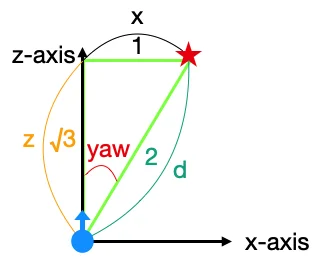 yaw 각도 계산에서 그림을 다시 보면 xz 평면 상에서 적 플레이어는 위와 같이 있다.