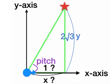 이번엔 위 그림처럼 3차원상에서 적(빨간 점)이 xz 평면 위에 y만큼 떠 있고 플레이어는 x축 방향을 바라보고 있다고 가정한다. 이때 플레이어의 pitch 축 각도 값은 0이라고 하자. 플레이어는 적을 향하기 위해 그림의 각도 pitch만큼 회전해야 한다.