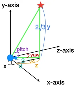 그다음 d = sqrt(x*x + z*z) 로 pitch 값 계산에 쓸 삼각형의 빗변을 구한다. atan2(x, z)로 yaw값을 구하고 atan2(y, d) 로 pitch 값을 구할 수 있다.