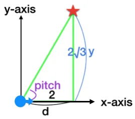 우리가 구해야 할 각도 pitch도 tan의 역함수인 atan2()로 계산할 수 있다. 위 그림에서 높이는 y, 밑변은 d이므로 atan2(y, d) 로 각도 pitch를 구할 수 있다.