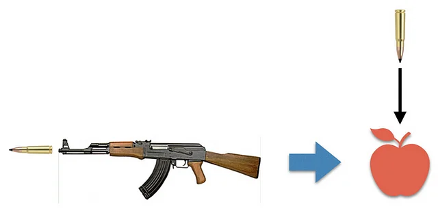 위 그림처럼 조준점이 적을 향하지 않아도 총을 발사할 때마다 탄환이 적의 머리 위에서 아래로 발사될 것이다. 아래는 이 과정에 대한 의사 코드이다.