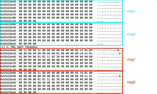 heap_overflow(0x100, 0x8, (unsigned char *)&fake_port, voucher_port);(2) OOL Port Fengshui