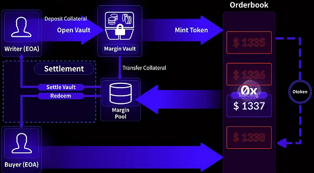 Opyn은 옵션의 직접적인 거래 대신 ERC20 토큰을 이용한 장외거래 방식과 제로엑스(0x) 프로토콜을 통한 주문 장부 거래방식을 적용했습니다. 옵션 거래자는 볼트 컨트랙트에 oToken과 그에 상응하는 사전에 등록된 기초자산을 예치하고, 제로엑스 프로토콜을 통해 적합한 거래 상대를 찾아 이를 교환합니다. 제로엑스 프로토콜에서 거래 상대방을 찾기 힘들 경우, 사용자는 oToken을 장외거래를 통해 직접 교환할 수 있습니다. 또한 옵션 행사 시 만기 결제가와 행사가의 차액을 지급하는 현금 결제 메커니즘을 채택하고 있습니다.