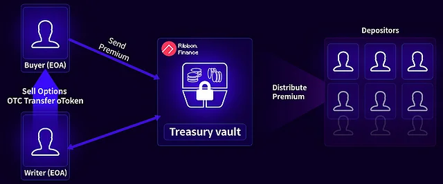 Ribbon Finance를 사용하고자 하는 프로토콜은 Theta 이외에도 Treasury라는 서비스를 선택해 사용할 수 있습니다. 옵션 매도자의 입장에서 Treasury를 사용하고 싶은 프로토콜은 Ribbon Treasury 팀에 연락해서 프로토콜의 가치를 측정받고, 가치가 일정 수준 이상일 경우 Treasury에 자신의 볼트를 등록할 수 있습니다. 볼트를 등록하면 기초자산을 예치하고 내부 토큰을 발급받을 수 있습니다. Treasury가 Theta와 다른 점은 기초자산으로 해당 프로토콜의 거버넌스 토큰을 예치한다는 점, 그리고 프리미엄을 전달 받을 때 USDC의 형태로 받아 예치자들에게 내부 토큰의 비율만큼으로 분배한다는 점입니다.