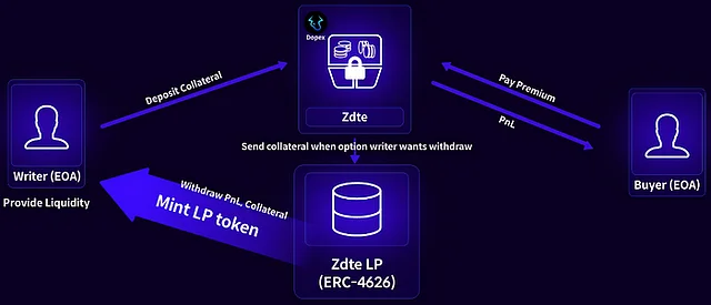Dopex는 라운드의 관리를 위해 0dte 상품을 운영합니다. Dopex의 0dte 상품은 하루짜리 만기를 가지는데, 특이하게도 매일 만기와 함께 이전에 사용된 담보를 다음날의 상품의 담보로 전환되도록 하는 시스템을 사용하고 있습니다. 옵션 구매자는 주로 스프레드 옵션을 구매하며, 이러한 옵션은 자동 시장 거래자(Automated Market Trader, AMT)가 설정한 10% 내외의 범위의 가격에 구매할 수 있도록 설정되어 있습니다. 옵션 매수자는 스프레드 포지션을 취하기 위해 외가격 범위에 놓인 상품을 매수해야 합니다. 스프레드 옵션을 선택함으로써 옵션 매수자는 더 적은 프리미엄을 취하게 되고, 매도자는 더 적은 리스크를 감수하는 포지션을 선택할 수 있게 됩니다.