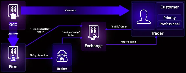 전통 금융(TradFi) 옵션 거래소에서는 일반적으로 브로커-딜러 주문 시스템을 사용합니다. 이는 중개업자가 브로커와 딜러 역할을 모두 수행하는 것을 의미합니다. 중개업자는 브로커로서 유저의 매수 및 매도 주문을 중재하고, 동시에 중개업자 본인의 주문을 위해 딜러로서의 동작을 수행합니다. 이 때 중개업체의 자체 계정을 위한 거래를 사설 주문(proprietary order)이라고 합니다. 개인이 주문을 넣으면 거래소는 이들 주문을 알맞은 상대방의 주문과 짝지어 중개 업자에게 주문 실행을 위임합니다. 옵션 정산은 중앙청산소로써 작용하는 옵션 클리어링 기관(Option Clearing Corporation﹒OCC)에서 관리합니다.
